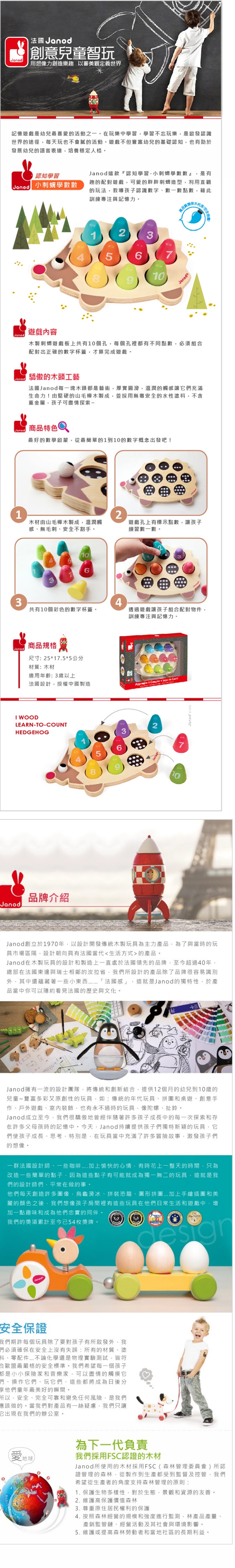 Janod這款『認知學習-小刺蝟學數數』,是有趣的配對遊戲,可愛的胖胖刺蝟造型,利用直觀的玩法