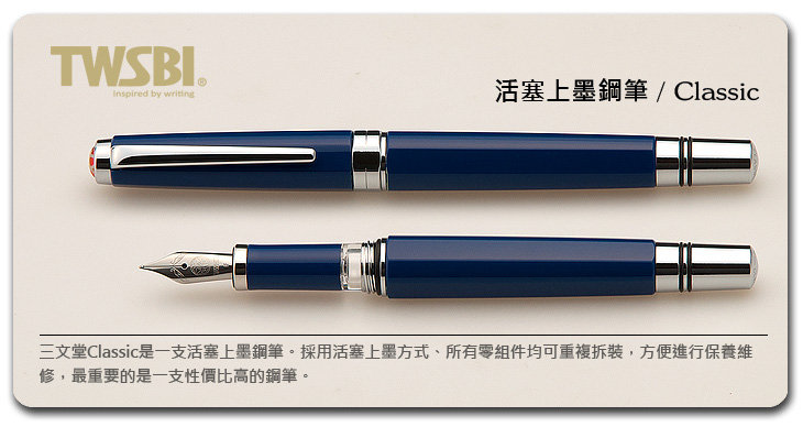 商品品名:臺灣 TWSBI 三文堂 Classic 寶藍桿活塞上墨鋼筆(新版) / 支