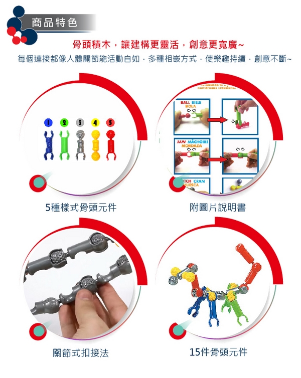 連接、旋轉、延伸! 不同於傳統的堆疊,只要兩個以上的骨頭積木相接,就能變成動態作品!快來