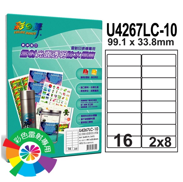 >{振昌文具}【請先來電洽詢庫存】彩之舞 U4267LC-10 進口雷射光面透明防水標籤 2x8/16格圓角(99.1*33.8mm) - 10張/包