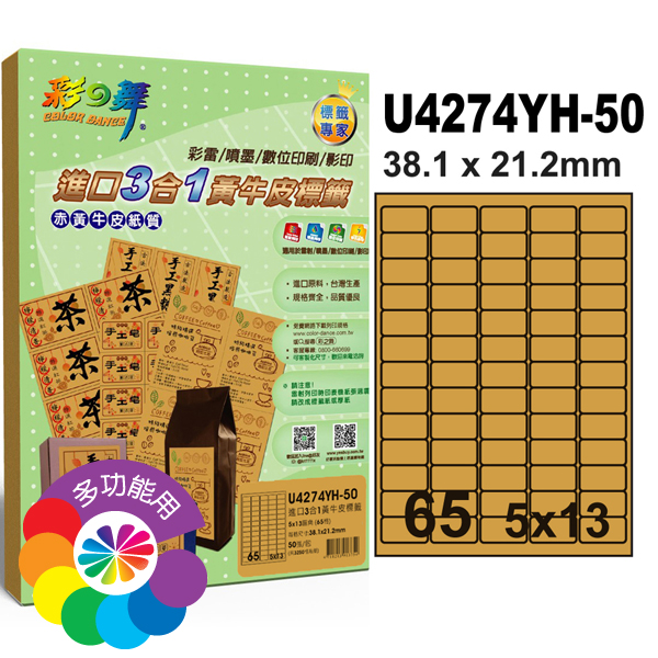 >{振昌文具}【請先來電洽詢庫存】彩之舞 U4274YH-50 進口3合1黃牛皮標籤 5x13/65格圓角(38.1*21.2mm) - 50張/包