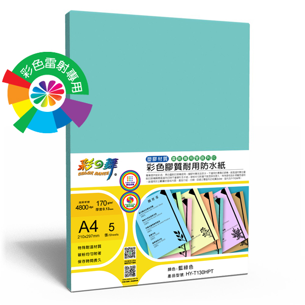 >{振昌文具}【請先來電洽詢庫存】彩之舞 HY-T130HPT 彩雷彩色膠質耐用防水紙-藍綠色 170g A4 (塑膠材質) - 5張/包