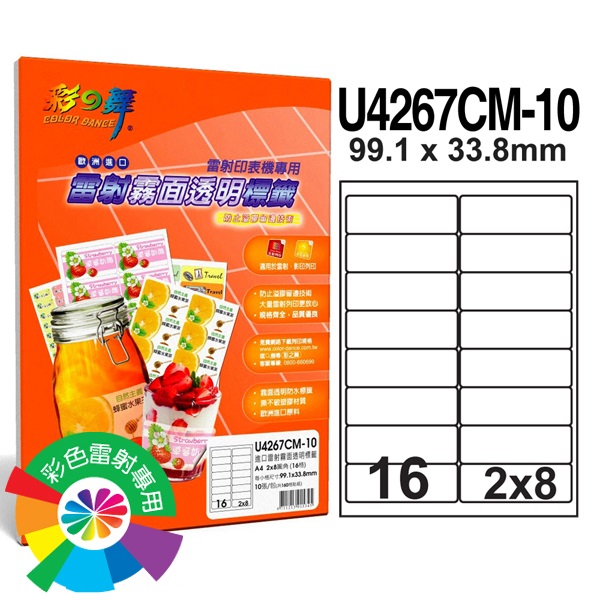 {振昌文具}【請先來電洽詢庫存】彩之舞 U4267CM-10 進口雷射霧面透明防水標籤 2x8/16格圓角(99.1*33.8mm) - 10張/包