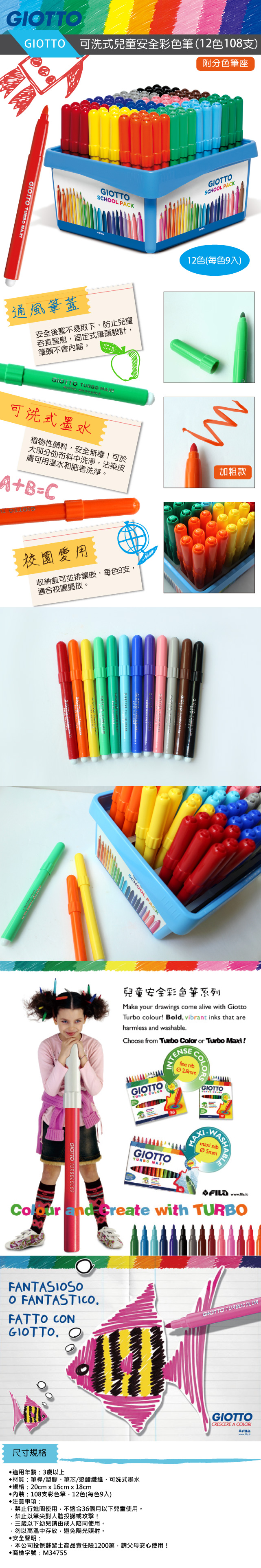 {振昌文具}【請先來電洽詢庫存】【義大利 GIOTTO】524000 可洗式兒童安全彩色筆(12色108支)附分色筆座 /盒