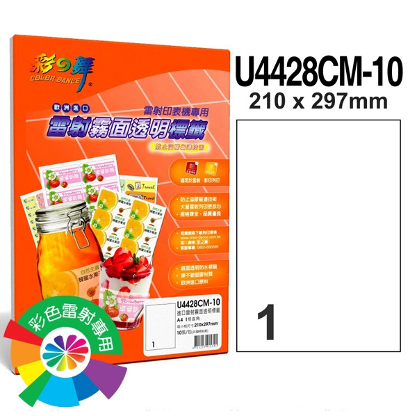 {振昌文具}【請先來電洽詢庫存】彩之舞 U4428CM-10 進口雷射霧面透明防水標籤 1格直角 A4全頁(210*297mm) - 10張/包
