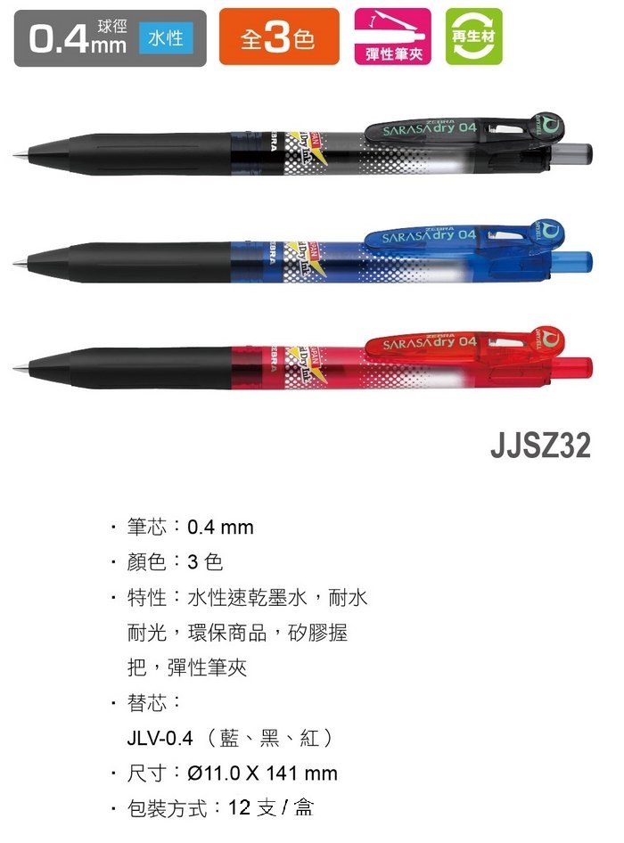 >日本 斑馬 SARASA D1 再生材 0.4mm 水性 速乾 JJSZ32 鋼珠筆 12支/盒