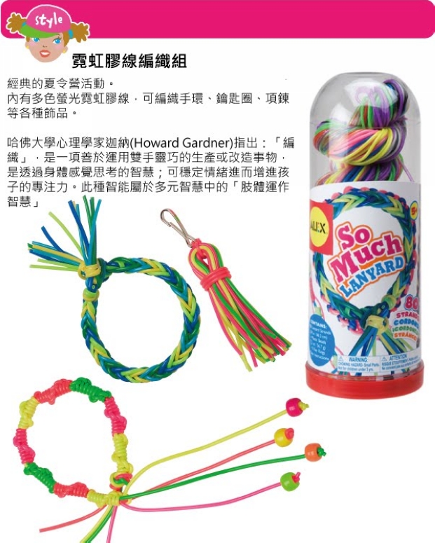 經典的夏令營活動,內有多色螢光霓虹膠線,可編織手環、鑰匙圈、項鍊等各種飾品喔~