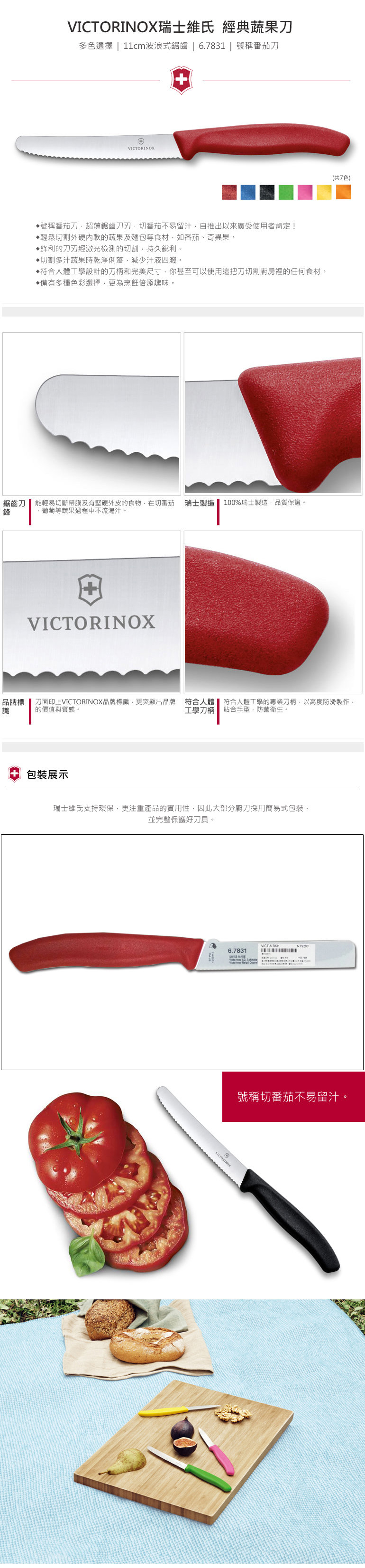 ※高防滑Fibrox手柄系列刀具可放入洗碗機清洗,但請留意需固定刀具,避免碰撞、損壞刀具,並應於清洗完畢後立即取出擦乾、收納。※建議避免使用傳統磨刀石,由於力量與角度不易掌握,若有磨刀需要,建議使用VICTORINOX的磨刀棒或磨刀器。品牌介紹: