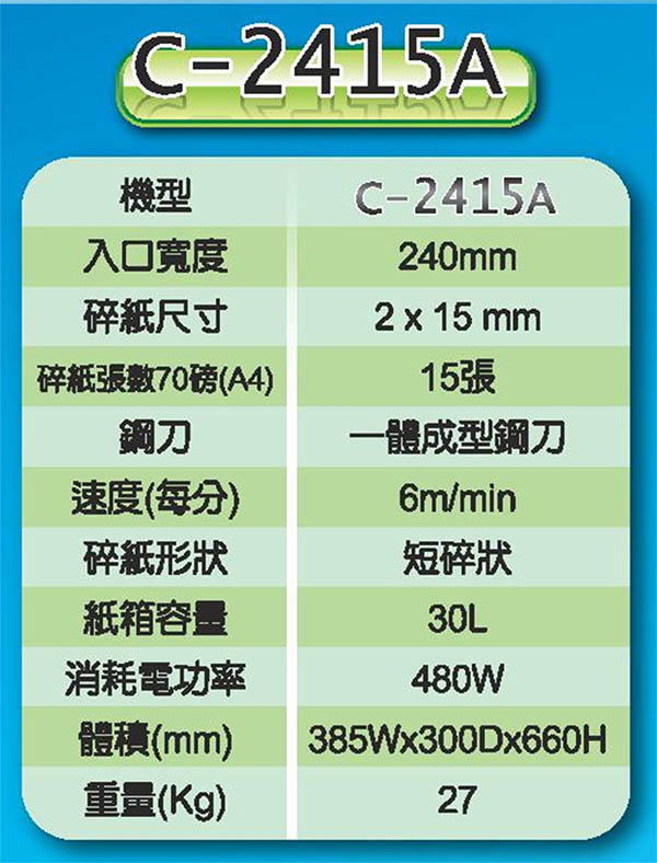 >禾昌 Genius 環保標章 A4 短碎狀 240mm / 2*15mm / 15張 / 30L 鐵製 碎紙機 台灣製 / 台 C-2415A(訂製品,確認訂購後無法退換貨)