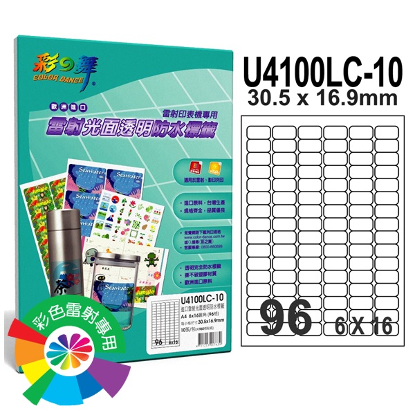 >{振昌文具}【請先來電洽詢庫存】彩之舞 U4100LC-10 進口雷射光面透明防水標籤 6x16/96格圓角(30.5*16.9mm) - 10張/包