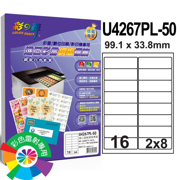 ★產品特性:採用銅版紙材表面帶有光澤度,搭配耐溫及加強黏性配方,使貼紙附著性強,就算是貼在玻璃或塑膠瓶上,也不會輕易脫落。多層次膠料可承受高溫的環境,依然不會改變其貼紙性質,在一般雷射、影印機列印上,表現卓越。雷射列印紙張設定請選擇特厚紙或超重磅光面選項,網路可直接下載WORD列印格式操作簡單方便,最適合於一般郵件地址、名條、產品標示、財產列管、容器等標籤的使用。
