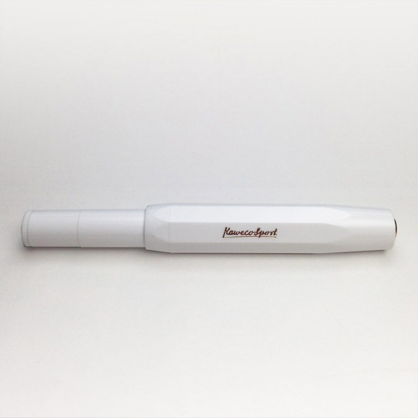延續1935年經典八角形,輕薄設計,收起時全長105mm,使用時全長133mm且直徑只有14mm,筆身輕巧,易於攜帶。採用堅固且輕盈的ABS強力塑膠材質,蓋頂刻有金色的Kaweco標誌與筆尖。內含黑色墨水一支,採用標準P8126/P8127規格卡式墨水管。