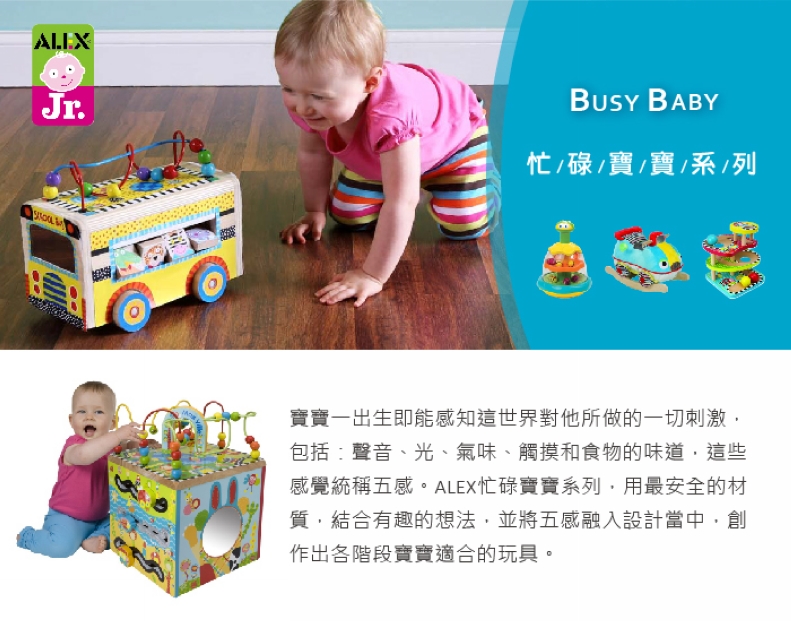 ALEX用一貫鮮明繽紛的色彩來做設計,吸引寶寶目光。一排一種顏色,幫助認識顏色與漸層概念。
