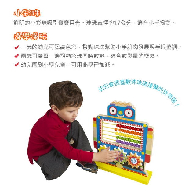 一歲的幼兒可認識色彩,撥動珠珠幫助小手肌肉發展與手眼協調。兩歲可開始數數,
