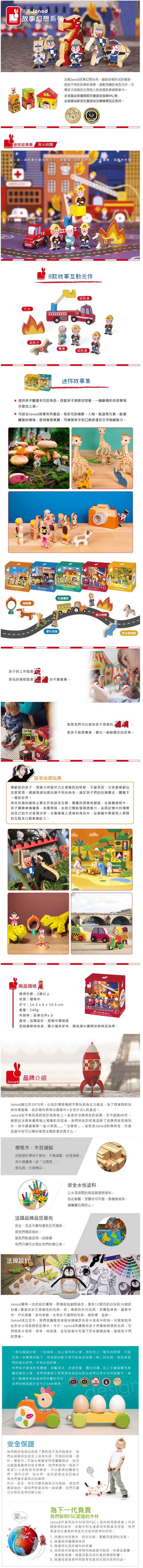 可結合Janod故事系列產品,有多元的場景、人物、軌道等元素,創建豐富的情境,使想像更真實,