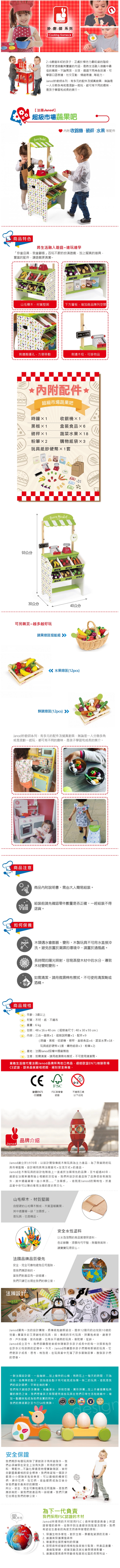 內附:時鐘、黑板、收銀機、磅秤、盒裝食品、x6蔬菜水果x18、玩具紙鈔硬幣x1套、購物紙袋x3、粉筆x2