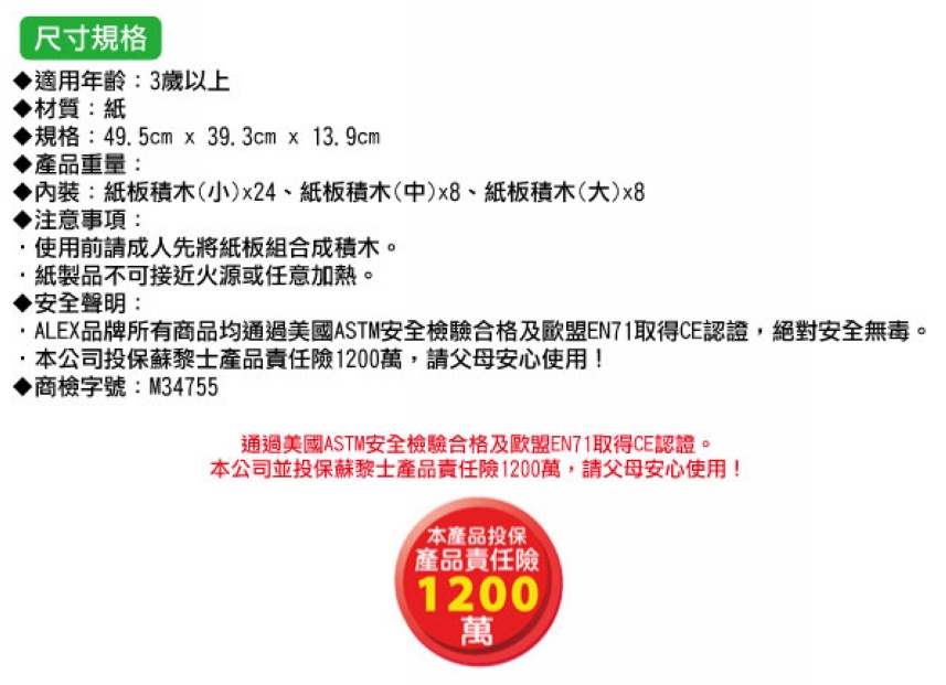 {振昌文具}【請先來電洽詢庫存】【美國ALEX】18CW 幼兒紙板大積木 /組