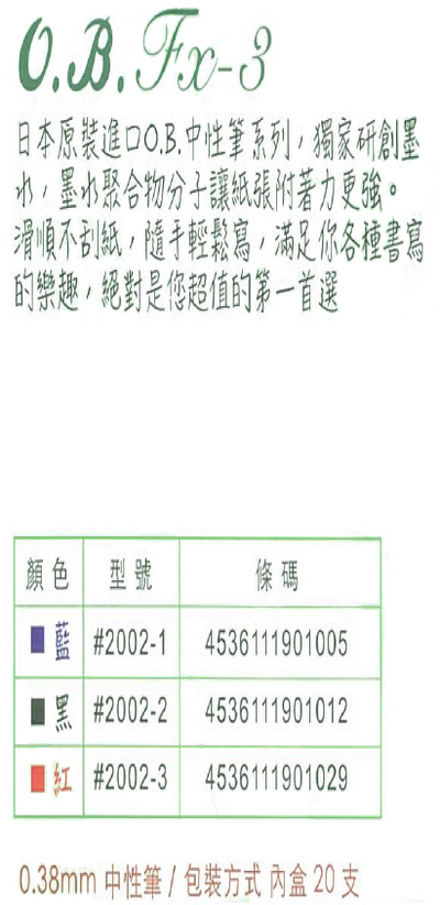 >O.B. Fx-3中性筆 0.38mm (20支/盒) OB#2002