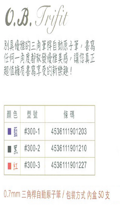 >O.B. Trifit三角桿自動原子筆0.7mm (50支/盒) OB#300