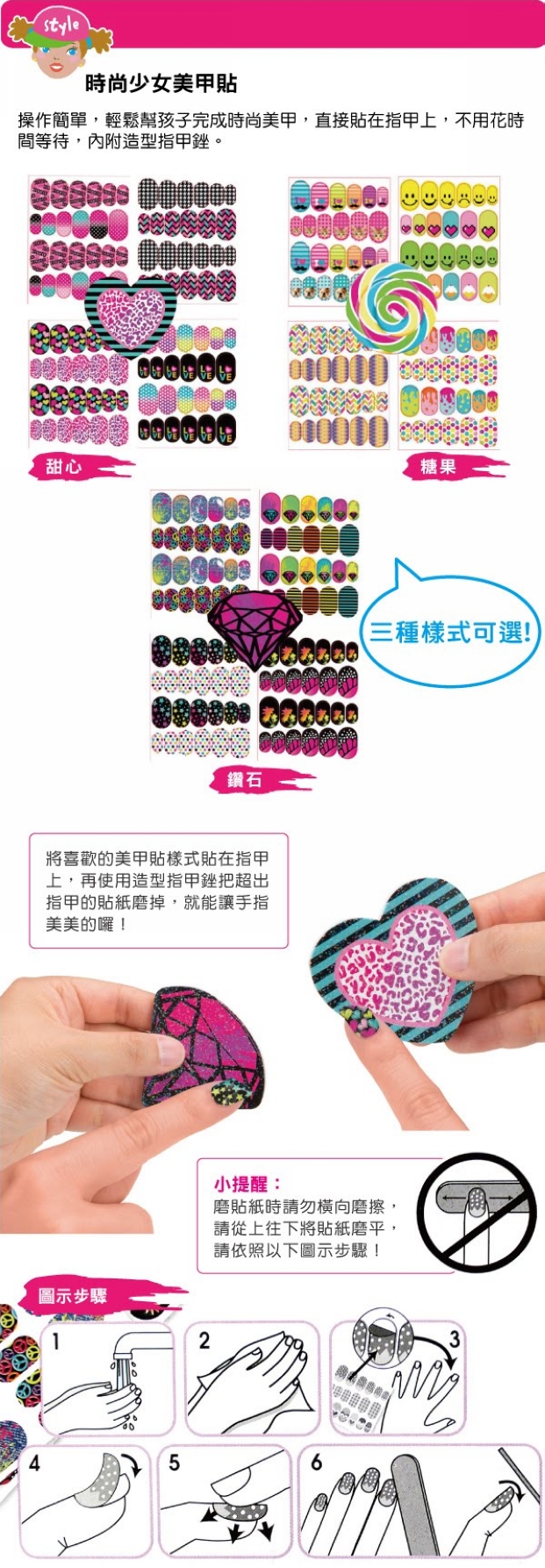 操作簡單,輕鬆幫孩子完成時尚美甲,直接貼在指甲上,不用花時間等待,內附造型指甲銼。