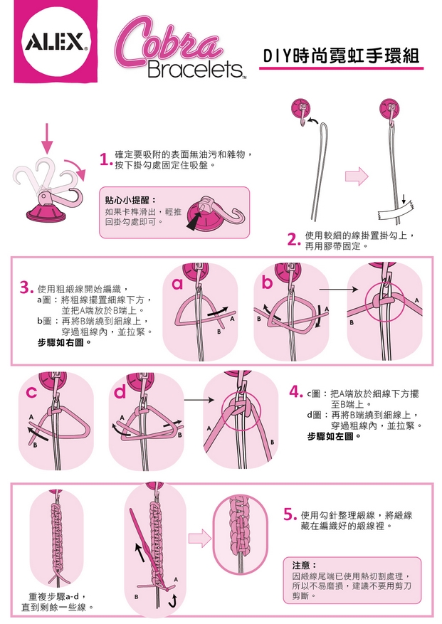 炫彩的霓虹線,利用特殊繩結法,編出流行又新潮的手環,內附吸盤可固定於桌面,讓手環編織省力又快速!!