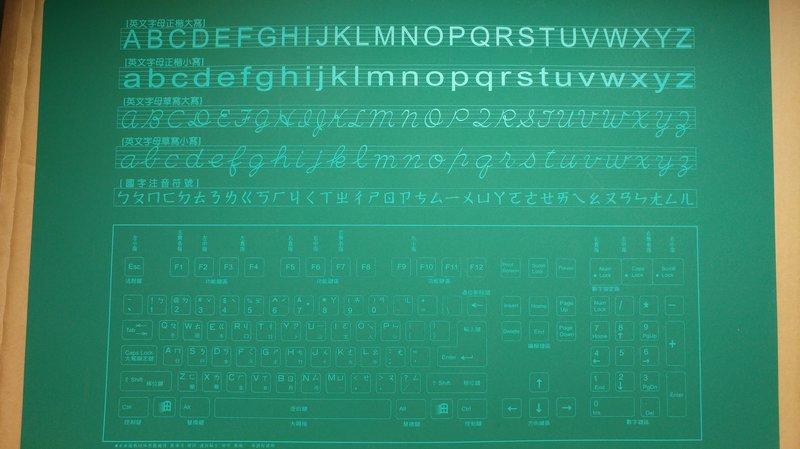 背面印有 英文字母 注音符號 電腦鍵盤按鍵圖 正反兩面.均可使用.可當桌面.滑鼠墊使用.保護桌子.等 規格大小約60cm x 40cm (厚)2mm