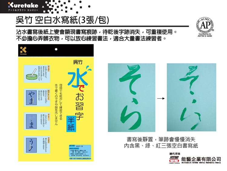 沾水書寫後紙上便會顯示書寫痕跡,待乾後字跡消失,可重複使用。
