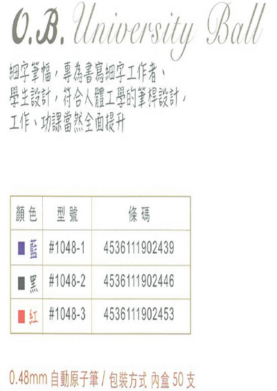 >O.B. University Ball自動原子筆0.48mm (50支/盒) OB#1048