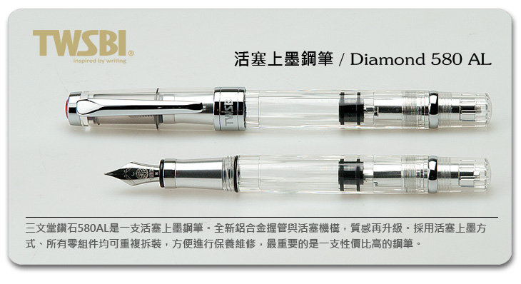 三文堂鑽石580AL是一支活塞上墨鋼筆。採用活塞上墨方式,所有零件均可重複拆裝,方便進行保養維修,最重要的是一支性價比高的鋼筆。