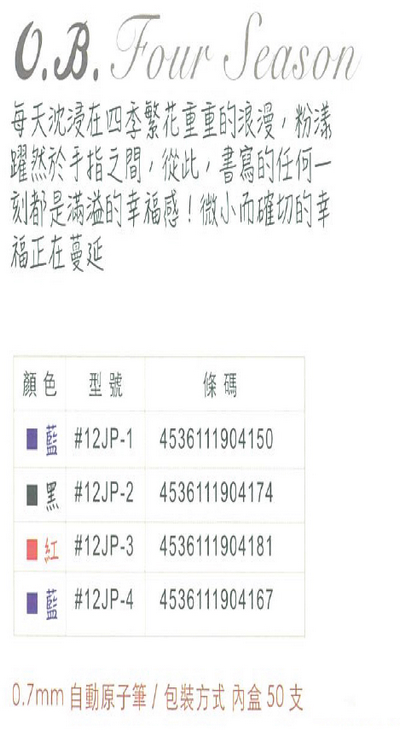 >O.B. Four Season自動原子筆0.7mm (50支/盒) OB#12JP