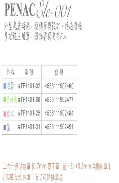 >O.B. PENAC Ele-001三合一多功能筆(0.7mm原字筆藍、紅 + 0.5mm自動鉛筆) (淡藍 / 1支) OB#TF1401-02