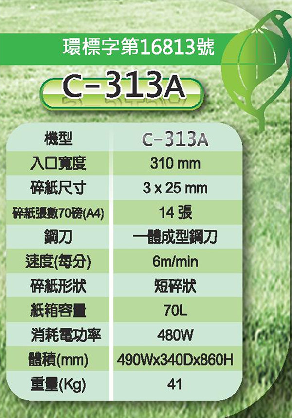禾昌 Genius 環保標章 A3 短碎狀 310mm / 3*25mm / 14張 / 70L 鐵製 碎紙機 台灣製 / 台 C-313A(訂製品,確認訂購後無法退換貨)